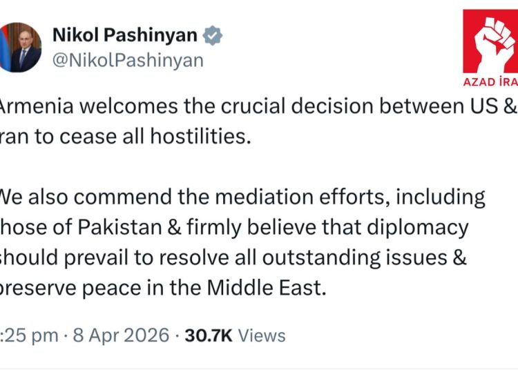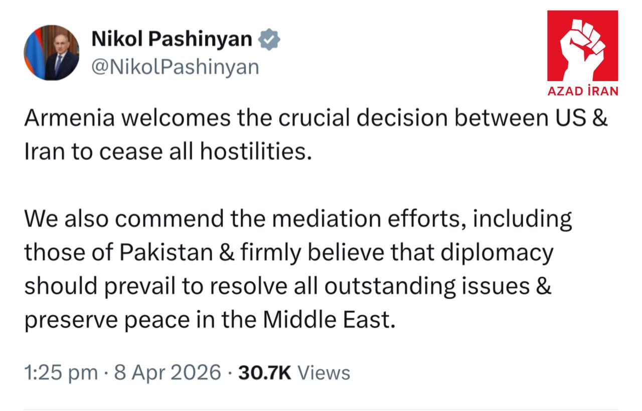 Ermənistanın baş naziri Nikol Paşinyan ABŞ və İran arasında bütün hərbi əməliyyatların dayandırılması ilə bağlı əldə olunan atəşkəs razılaşmasını alqışlayıb.