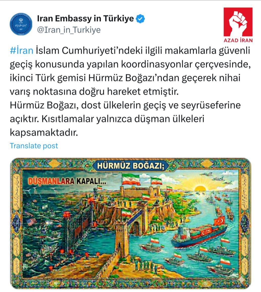 Hörmüz boğazı dost ölkələrin keçidi və hərəkəti üçün açıqdır. Məhdudiyyətlər yalnız düşmən ölkələrə şamil olunur”, – deyə, paylaşımda vurğulanıb.