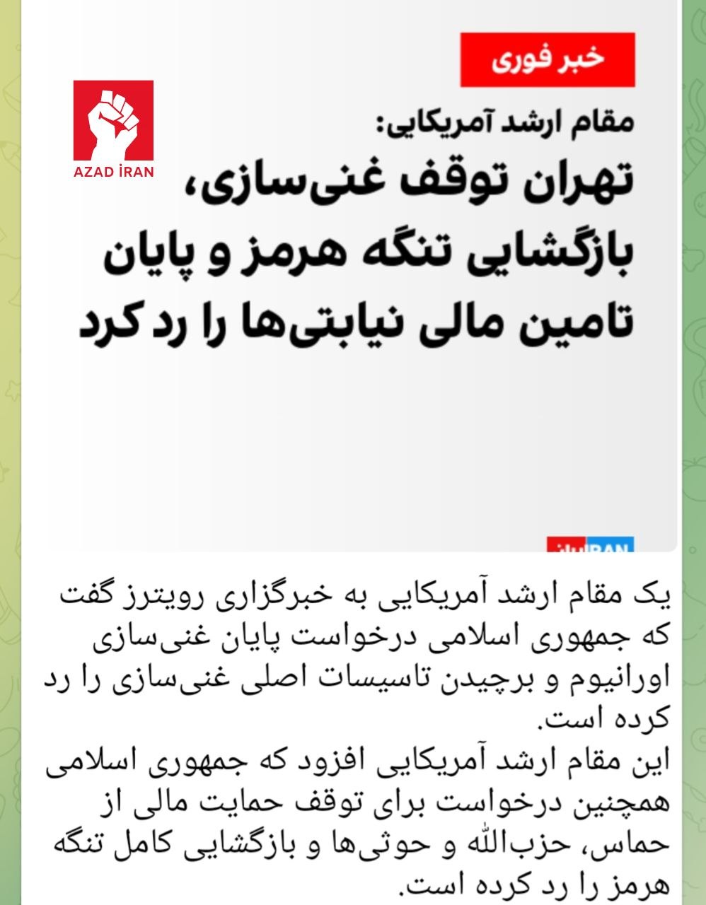 O, əlavə edib ki, İran eləcə də HƏMAS, Hizbullah və Husilərə maliyyə dəstəyini dayandırmaq və Hörmüz boğazını tamamilə açmaq tələblərindən də imtina edib.